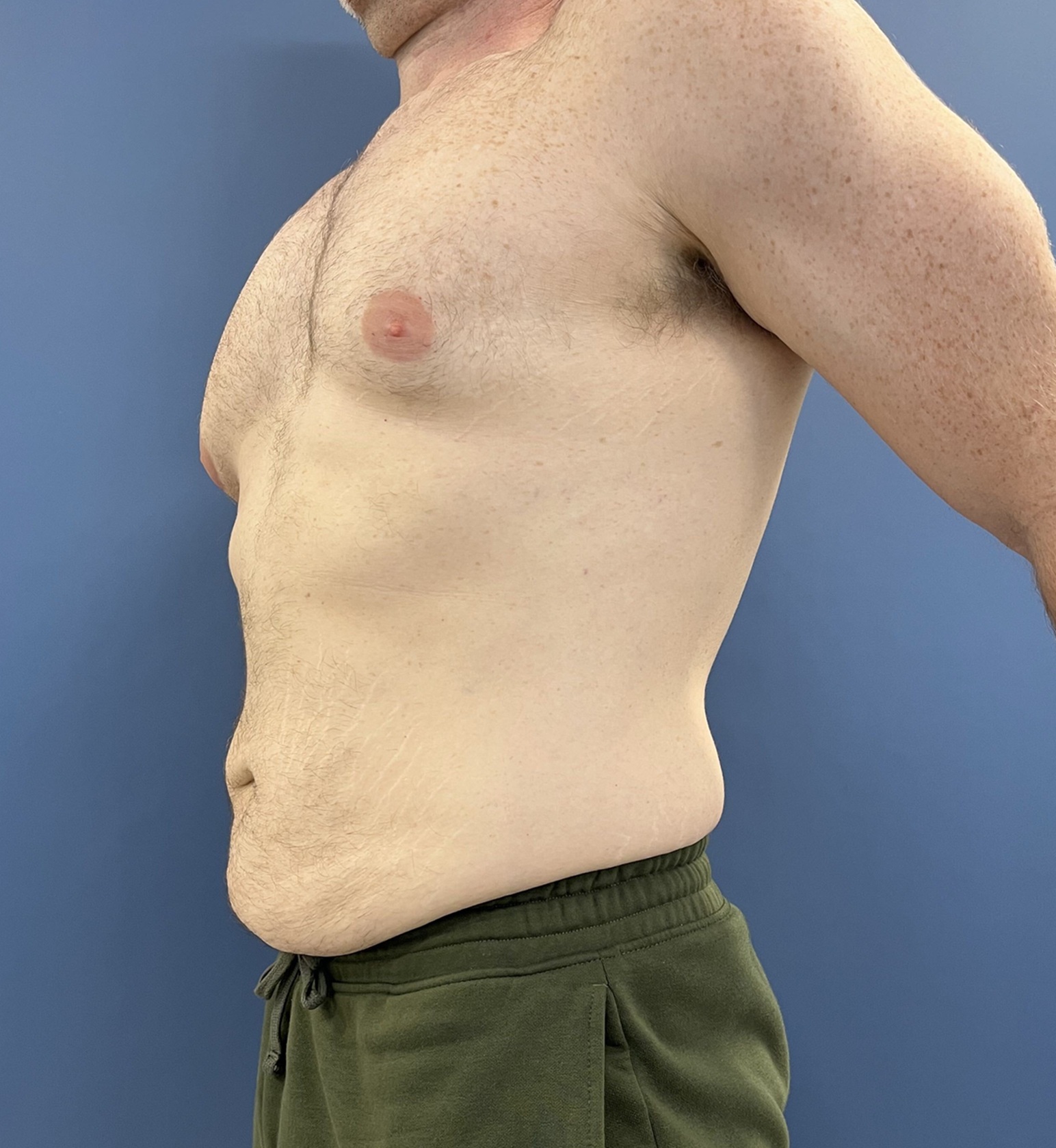 Dr. Glenn Lyle in Raleigh, North Carolina for a male tummy tuck as well as Vaser assisted liposuction of the chest. The incision line started in the back to address the loose skin and the excess fat of the flanks and excess pannus or  hanging skin apron from the belly button down. The Vaser treatment help to flatten his enlarged chest with minimal incision.