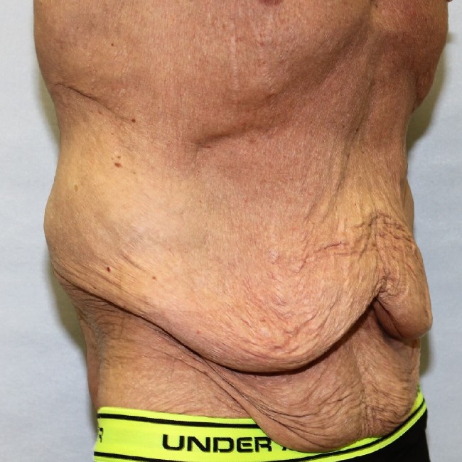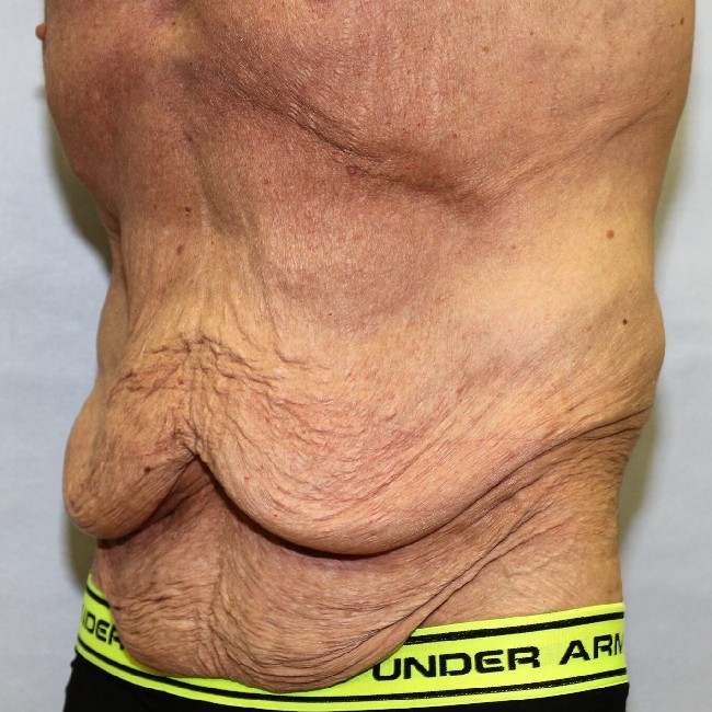 This is a 56-year-old gentleman who had prior bariatric surgery with over 100 pounds of weight loss. Unfortunately, he also had to have spinal fusion and had atrophy of his lower trunk. His excessive loose skin of his abdomen draped down below his pubic area, and he desired removal. He did have a host of underlying health problems but was considered a moderate risk candidate for abdominoplasty.