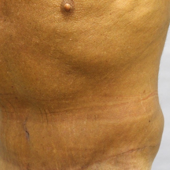 He has a very flat abdomen and flank area now. Post-bariatric body contouring has to be tailored for each individual. This patient had primarily excess skin and virtually no fat, and his procedure was entirely done with excisional technique with no need for liposuction. The loose skin of his abdomen no longer causes him problems.