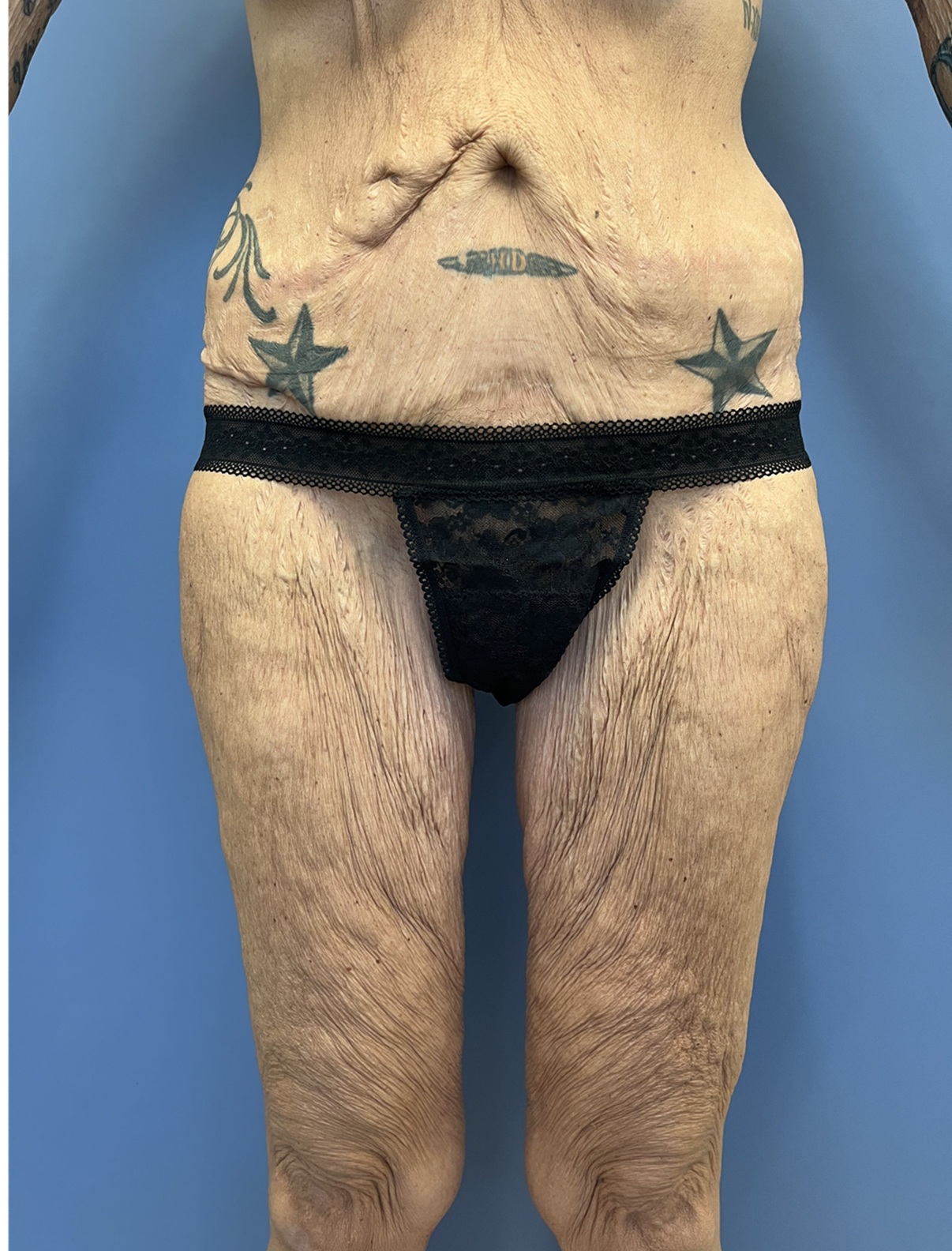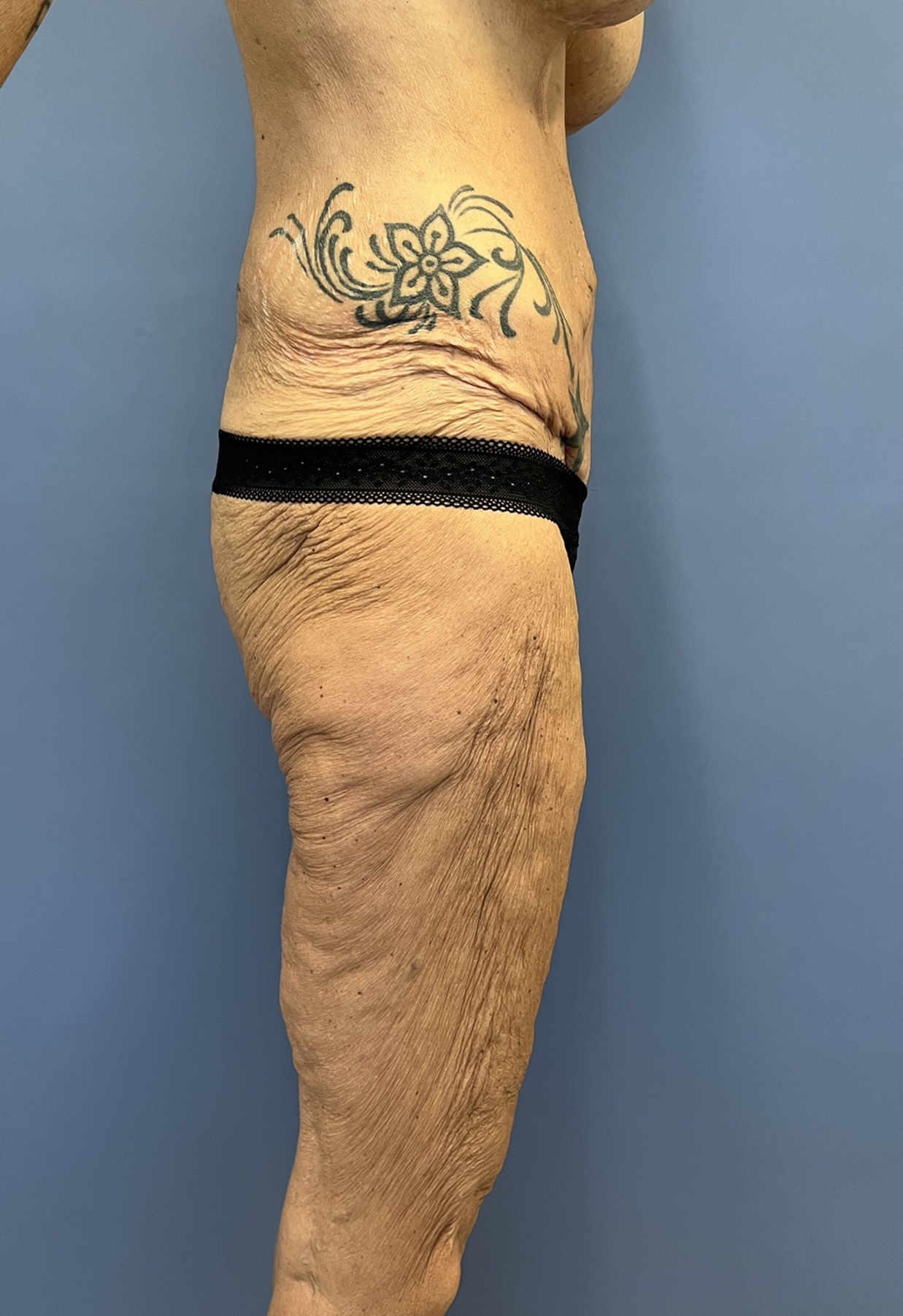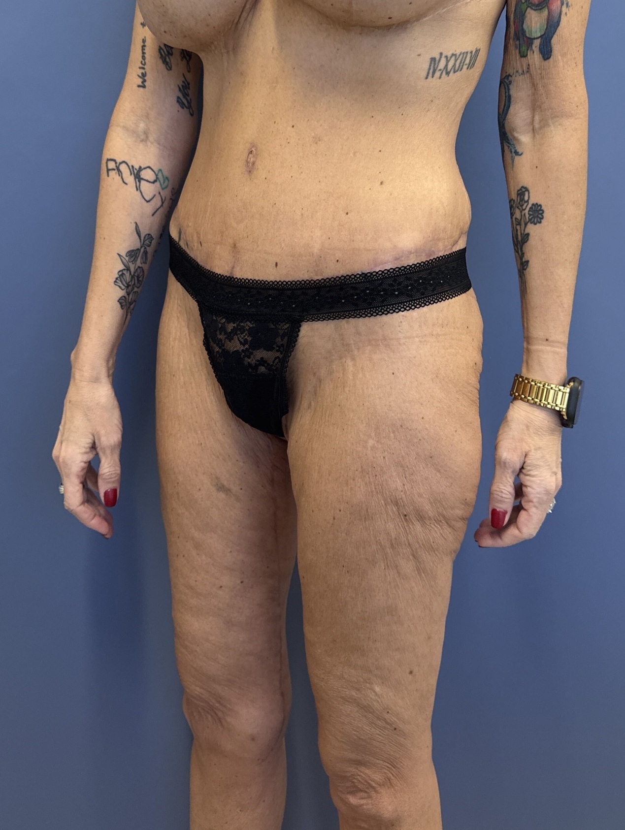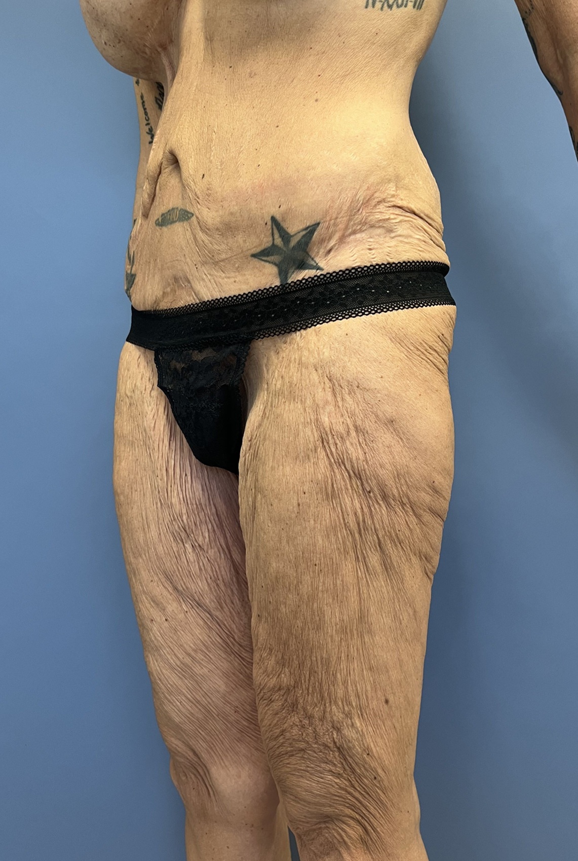 Concern: This 56-year-old woman had undergone major weight loss with the use of GLP-1. She had a history of previous tummy tuck and breast augmentation and lifting and was concerned about the appearance of her loose saggy thighs and abdomen. She had undergone abdominal surgery which left her with a scar on the right side of her abdomen and was hopeful to have a flatter tummy and thighs.