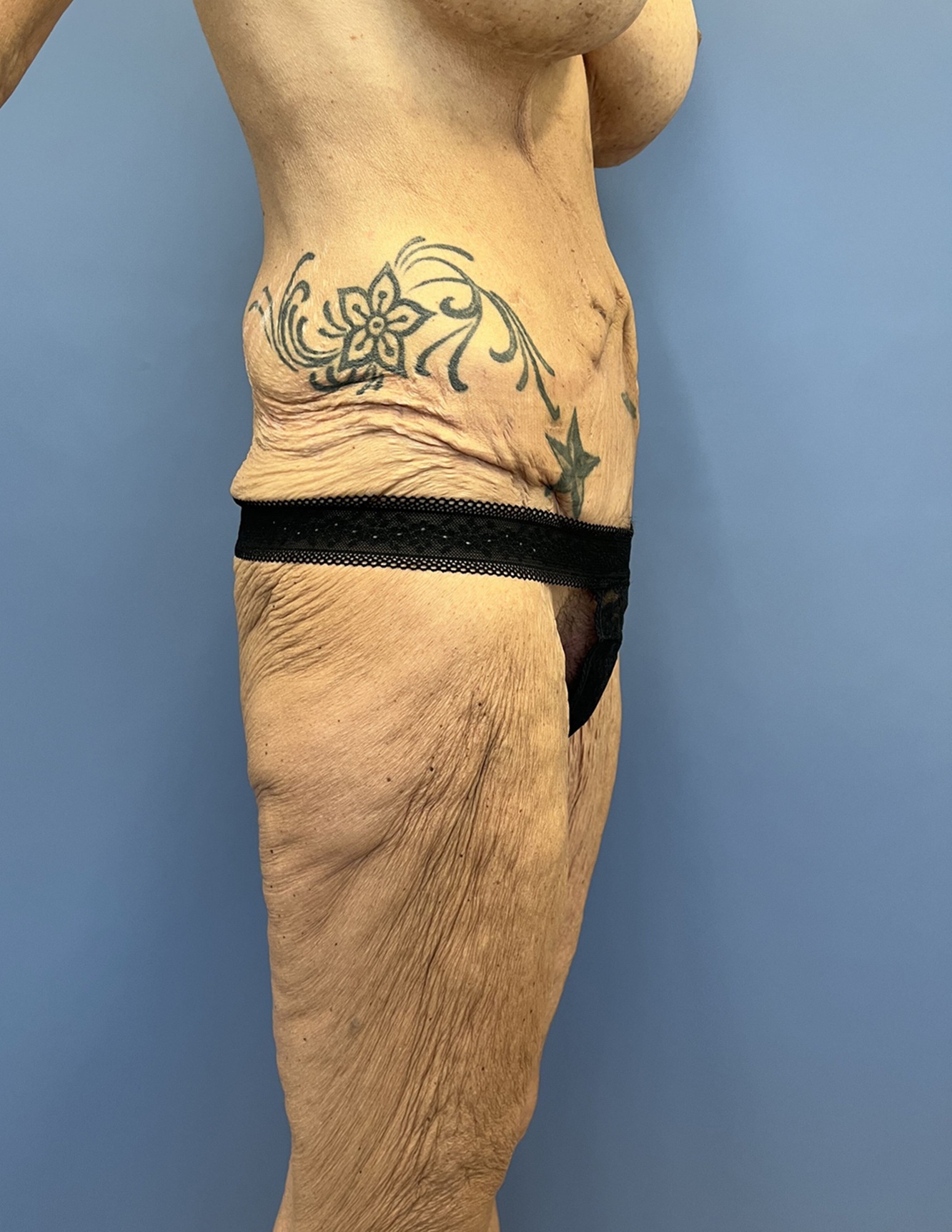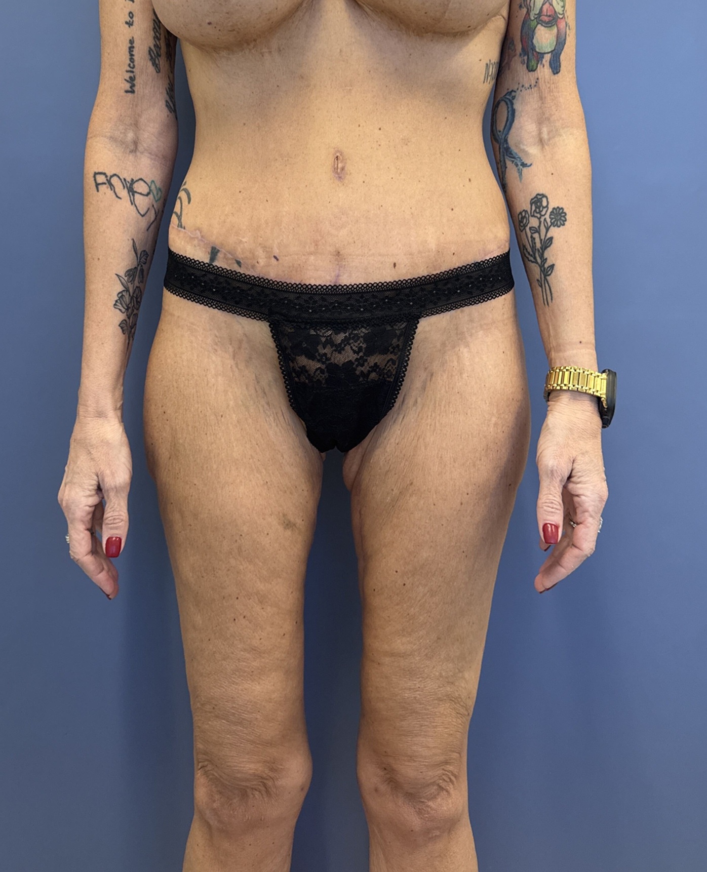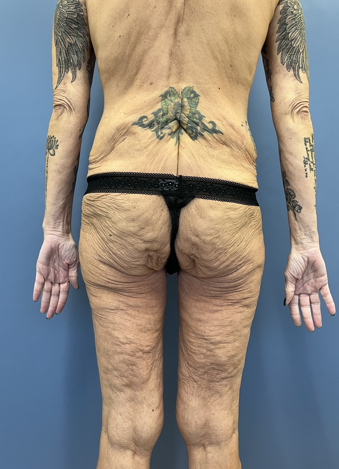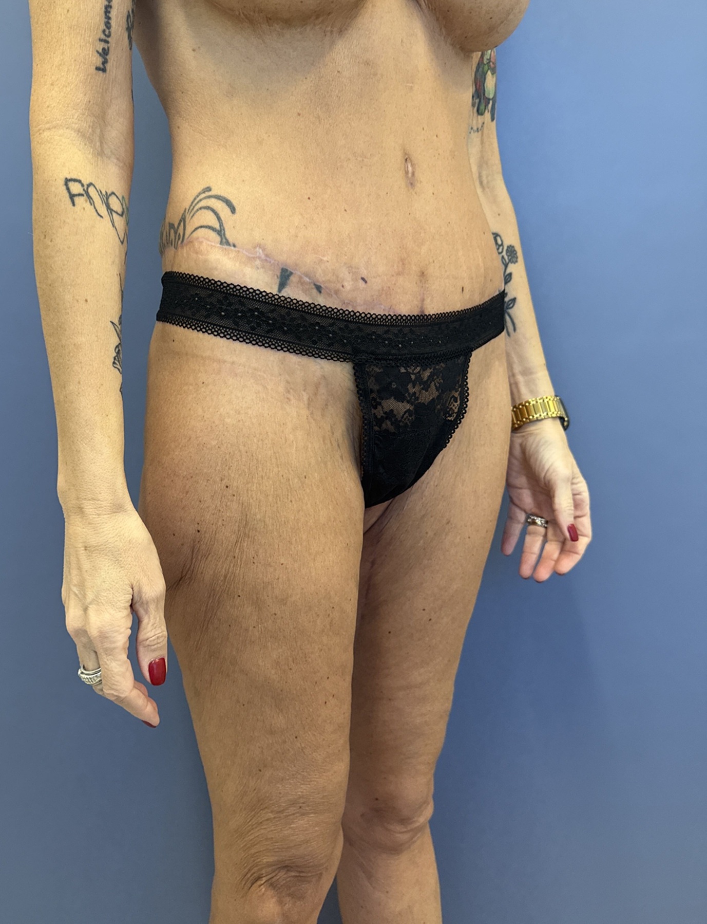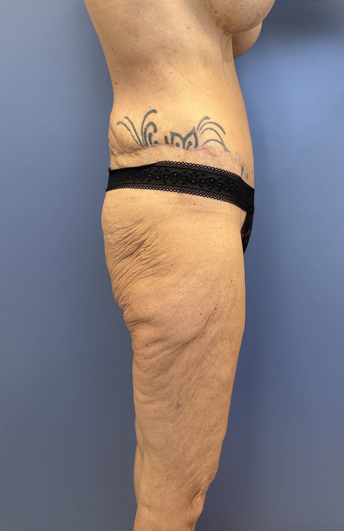 Concern: This 56-year-old woman had undergone major weight loss with the use of GLP-1. She had a history of previous tummy tuck and breast augmentation and lifting and was concerned about the appearance of her loose saggy thighs and abdomen. She had undergone abdominal surgery which left her with a scar on the right side of her abdomen and was hopeful to have a flatter tummy and thighs.