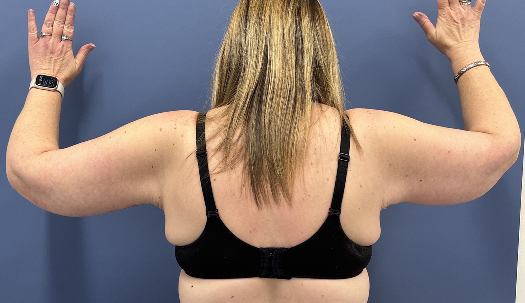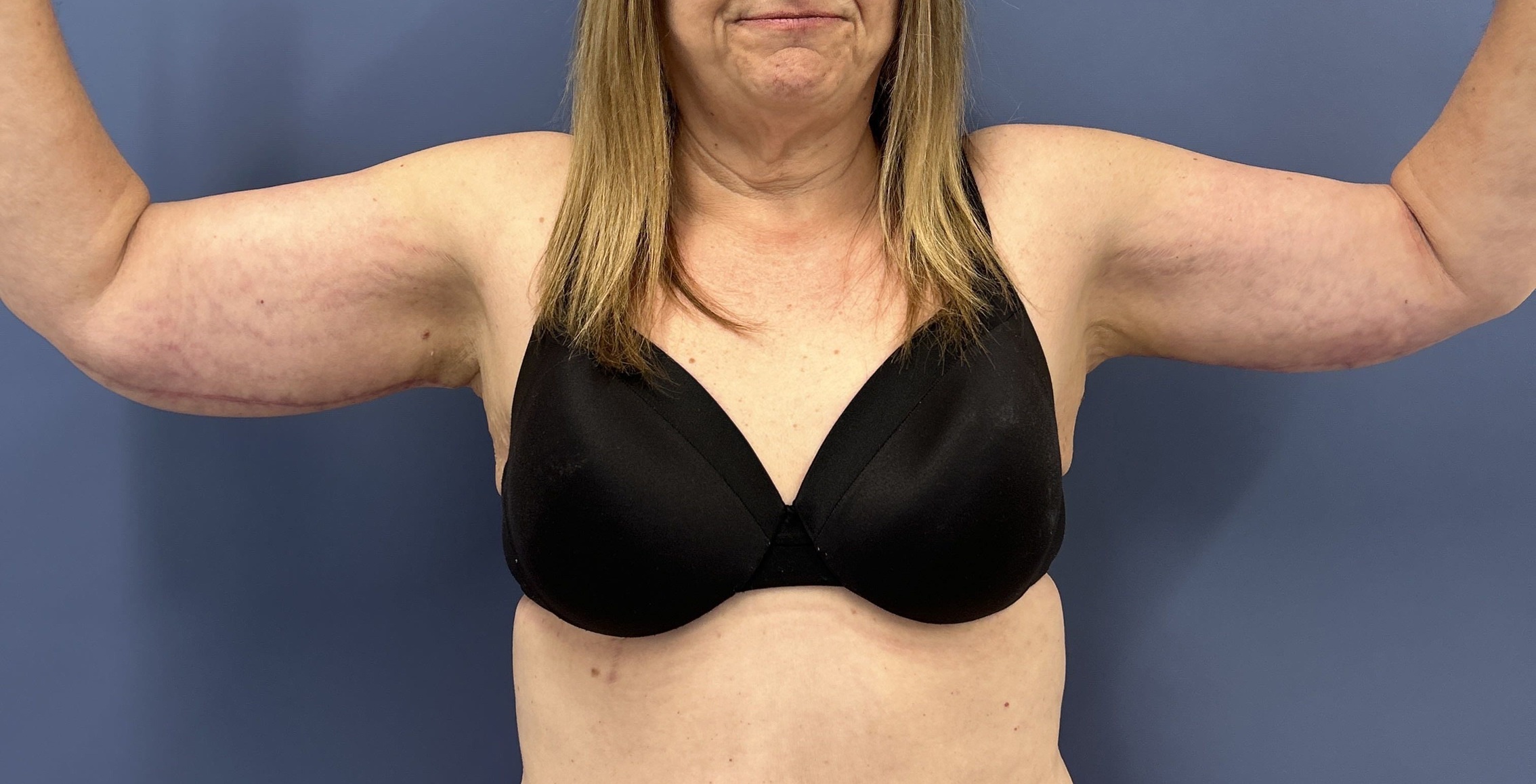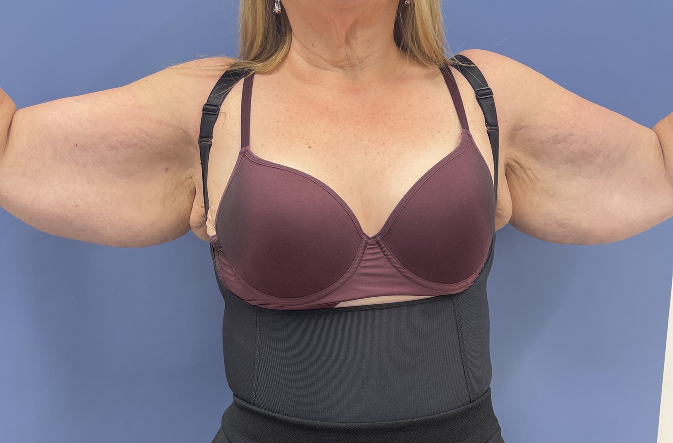 The patient underwent a standard brachioplasty or arm lift. Her recovery was uneventful, wearing Ace wraps on her arms for a week followed up with compression sleeves for 3 months. Her incision was managed with prolonged taping. This helps to reduce scarring which also is helped with scar creams.