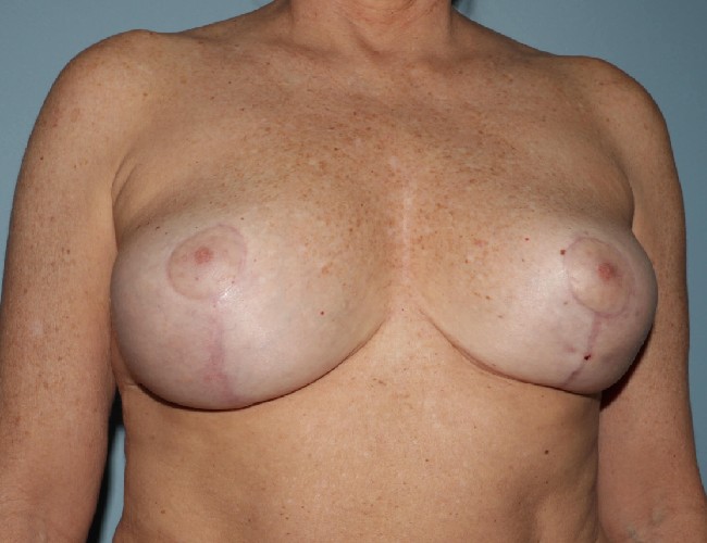 Removal of breast implants without replacement has become much more common in the last 5 -10 years or so. Although there are many reasons that lead women to choose this decision; a very common one is that they feel that their breasts are too large. Many decide that they no longer want implants. Unfortunately with aging, breast drooping occurs and removal of the implants will most certainly leave the breast quite droopy or ptotic. Explantation with breast lift is becoming more popular. Dr. Lyle is a specialist in this procedure. This 56-year-old woman had breast implants placed well over 10 years ago by another physician. She felt they made her breasts look too big especially as she had gained weight with aging. She could not get the information about her original implants but she was concerned that the removal alone would leave her quite droopy and lacking fullness. She underwent breast implant removal and breast lifting with some liposuction of her abdomen and flanks and fat transfer to the breasts. The fat transfer is primarily to help augment the mastopexy and must be done very carefully and judiciously to avoid future problems with mammograms. She was much happier with her smaller lifted-appearing breasts and did not miss her breast implants at all. She was found to have a 350 cc intact Smooth silicone gel implant on the right side and 375 cc gel implant on the left side. She had 100 cc of fat transferred to the left side and 60 cc to the right side.