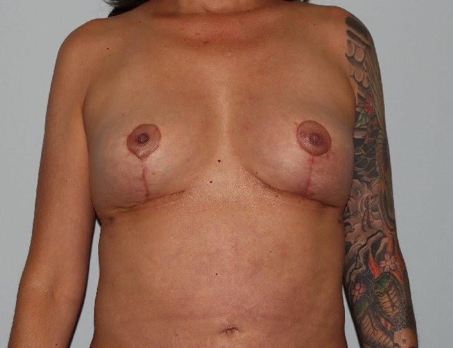 This 50 year old woman had saline breast implants placed by another physician about 15 years prior to consulting with Dr. Lyle. She had a periareolar lift done at that time. She now felt her breasts were too large. She had begun an exercise regime and with weigh loss and aging her breasts were beginning to sag and her breast implants caused aching when she worked out. She wanted her implants removed with no replacement. She was concerned about size and shape after explantation. She underwent a breast implant removal and mastopexy. She had some liposuction with fat grafting to the breasts to fill deficient areas rather than to truly augment the breast. She was found to have 350 cc saline implants filled with 400 cc. She had almost no capsule formation and the implants were under the muscle. She had 90 cc of fat placed in the subcutaneous space of the breasts avoiding deep injections into breast tissue. she was very happy with her smaller but lifted breasts. She was more comfortable working out and had relief of discomfort of her breast implants. Explantation with mastopexy is a difficult operation. The prior breast implant surgery will have altered the blood flow patterns to the nipple and potential nipple loss and sensory changes are possible. It is different than a standard mastopexy as the tissues have thinned out . Fat grafting may be performed however if a capsulectomy is performed, only a limited amount of fat can be added as an intact capsule can keep fat in place.