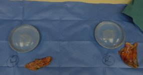 During the procedure, an en bloc technique was able to be performed. She underwent mastopexy with some limited fat grafting harvested from her abdomen. 160 cc of fat was delivered to each breast. Her capsules did not reveal any abnormal pathology.