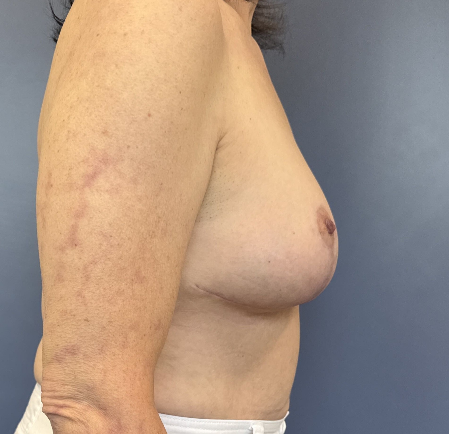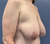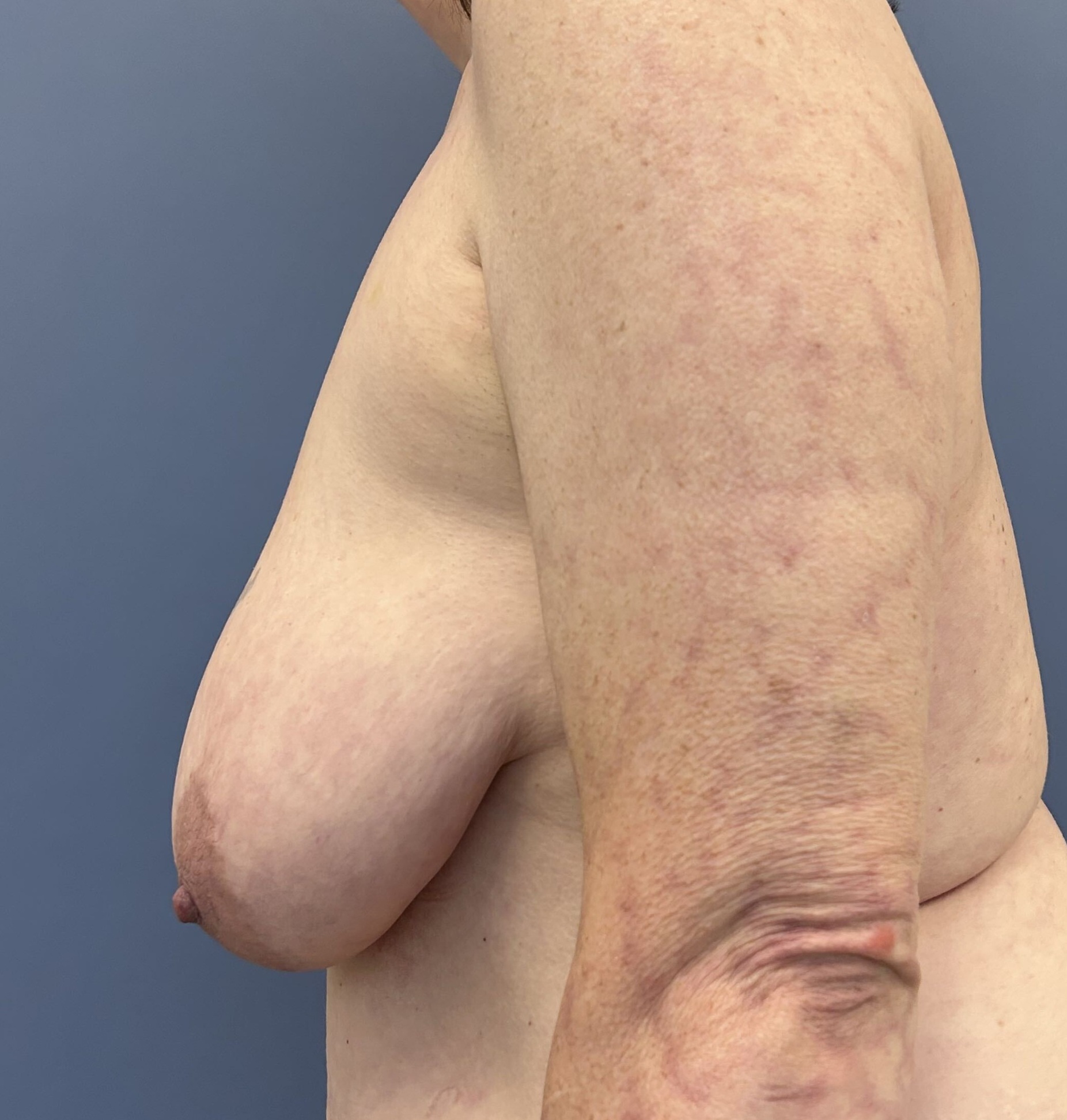 This 45-year-old woman had recently lost about 50 pounds and noticed significant drooping of her breasts. She was a D cup and hopeful to go down a small amount but was mostly concerned about the shape of her breasts and the sagging.
