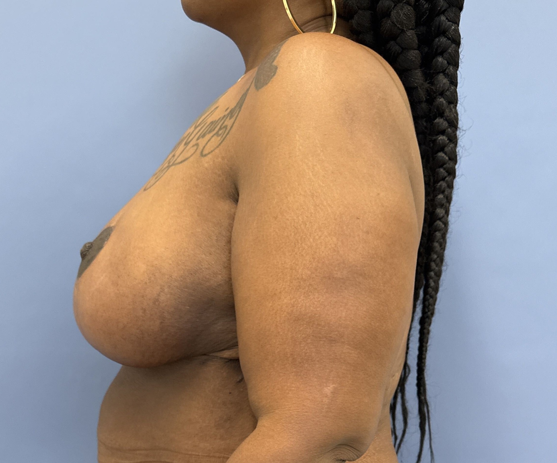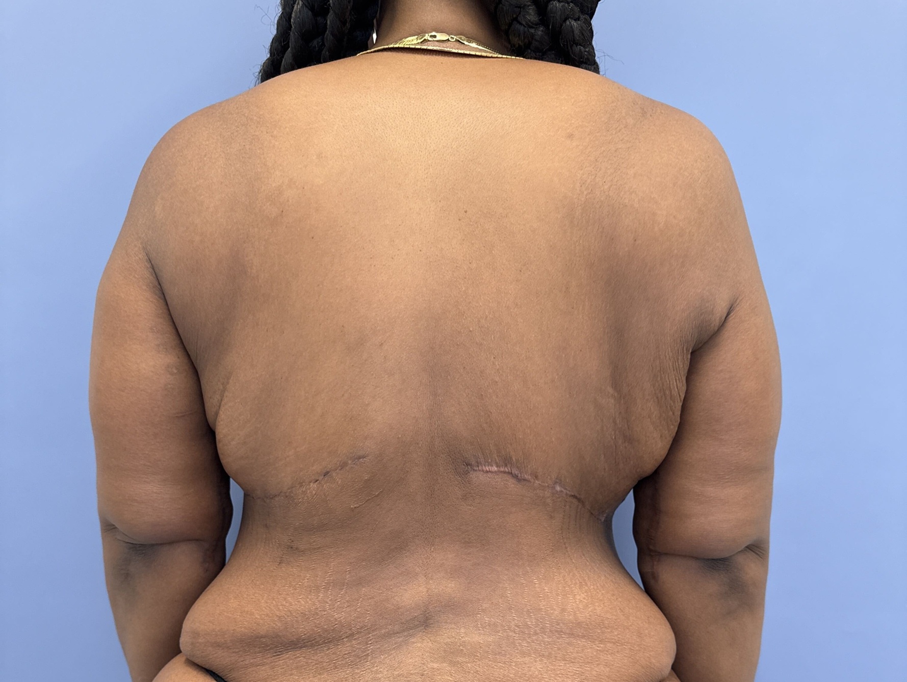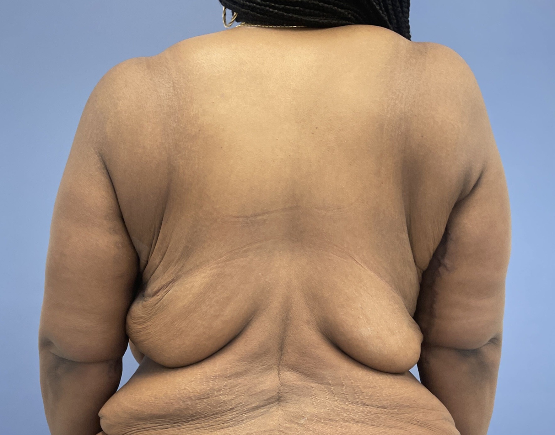 This 45-year-old woman had bariatric surgery but only lost about 50 pounds. She was still obese and has large pendulous breasts with back rolls. She had undergone a circumferential abdominoplasty and brachioplasty by Dr. Lyle in the past. She now wanted her breasts lifted and reduced.