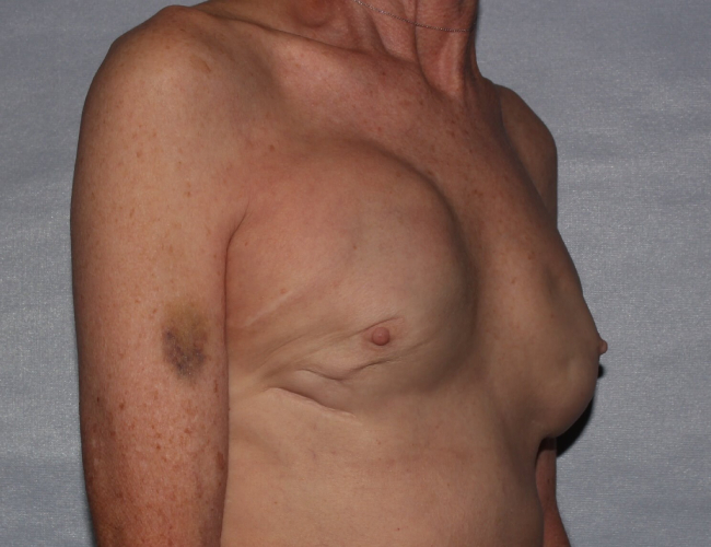 This 60 woman had prophylactic mastectomies performed when she was in her 20s with placement of a silicone gel breast implant. About 20 years later, the implant ruptured, and she had a replacement by another plastic surgeon with saline breast implants. She developed a painful contracture on the right breast and was unhappy with the appearance.