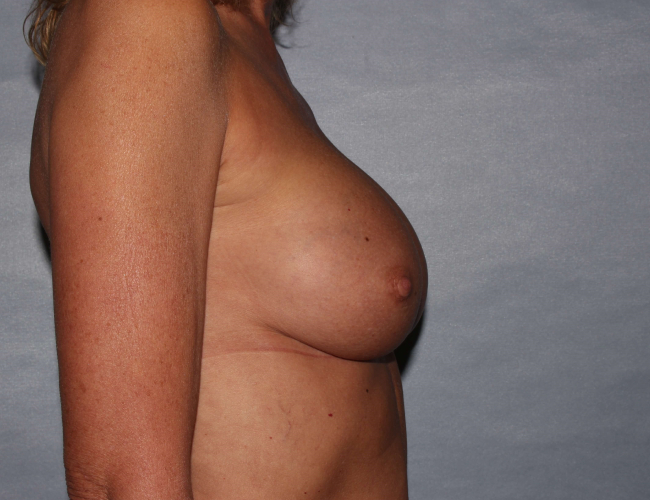 This 56-year-old woman had subglandular saline breast implants placed over 14 years prior to coming to Dr. Lyle for revision. She did not like the feel or look of her implants. She wished to be a bit larger and softer.