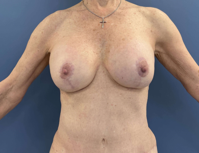 This 70-year-old woman had previous silicone gel breast implants in the 1980s with subsequent rupture in the 1990s. She had them replaced with saline implants, but then went back to silicone gel implants. Ultimately, she never had the appropriate appearance of her breasts and developed somewhat high-riding breast implants and drooping or breast ptosis over the implants. She was noted to have a firmer breast consistent with a capsular contracture and wished to have implants exchanged to a very similar size and a breast lift.