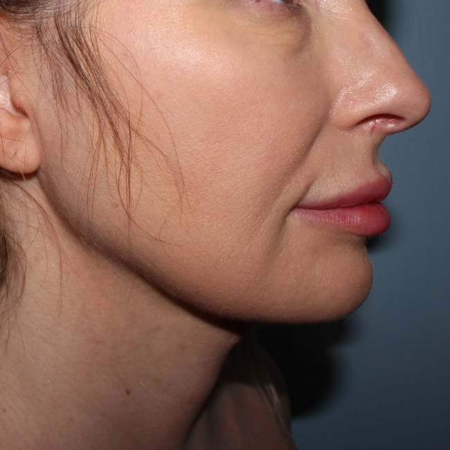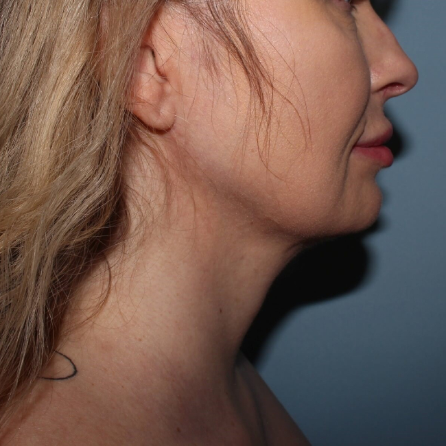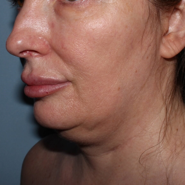 This 47-year-old woman had Vaser liposuction of her neck and submental area with placement of the I Glide Suture, leaving her with minimal, if any, scarring other than a small incision under the chin.