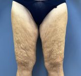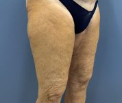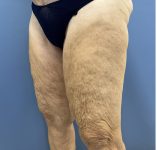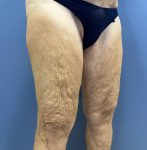 This 77-year-old woman had a new lease on life as she has lost a considerable amount of weight and was enjoying her retired lifestyle looking at the beach. She was very self-conscious about the loose skin on her arms breasts and thighs. She had a breast lift and brachioplasty as well as a revision of abdominoplasty done by another doctor. She was very pleased, and her final step was to improve the appearance of her thighs which were very loose.